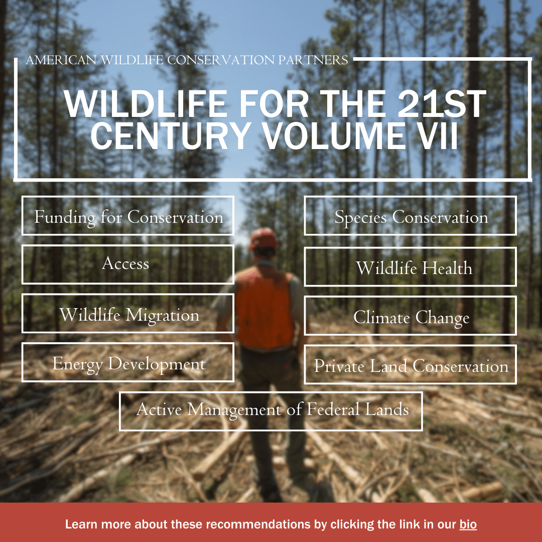This brings us to the recently released Wildlife for the 21st Century Volume VII, the AWCP’s most recent volume providing guidelines and recommendations to the next presidential administration and the next two Congresses. The nine recommendations included in this volume “will bolster fish and wildlife populations, enhance the conservation of America’s lands and waters, and provide crucial access opportunities for America’s tens of millions of sportsmen and sportswomen.” The following is a brief overview of each of the nine recommendations:
