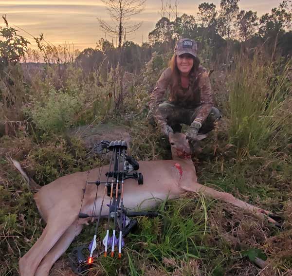 Thompson, Tanya - DATE: October 10, 2021 - LOCATION: Rankin County, MS - SPECIES: Whitetails - DETAILS: First deer! Started shooting her new Mission by Mathews last year, and was able to take this 126 lbs. doe at 20 yards.